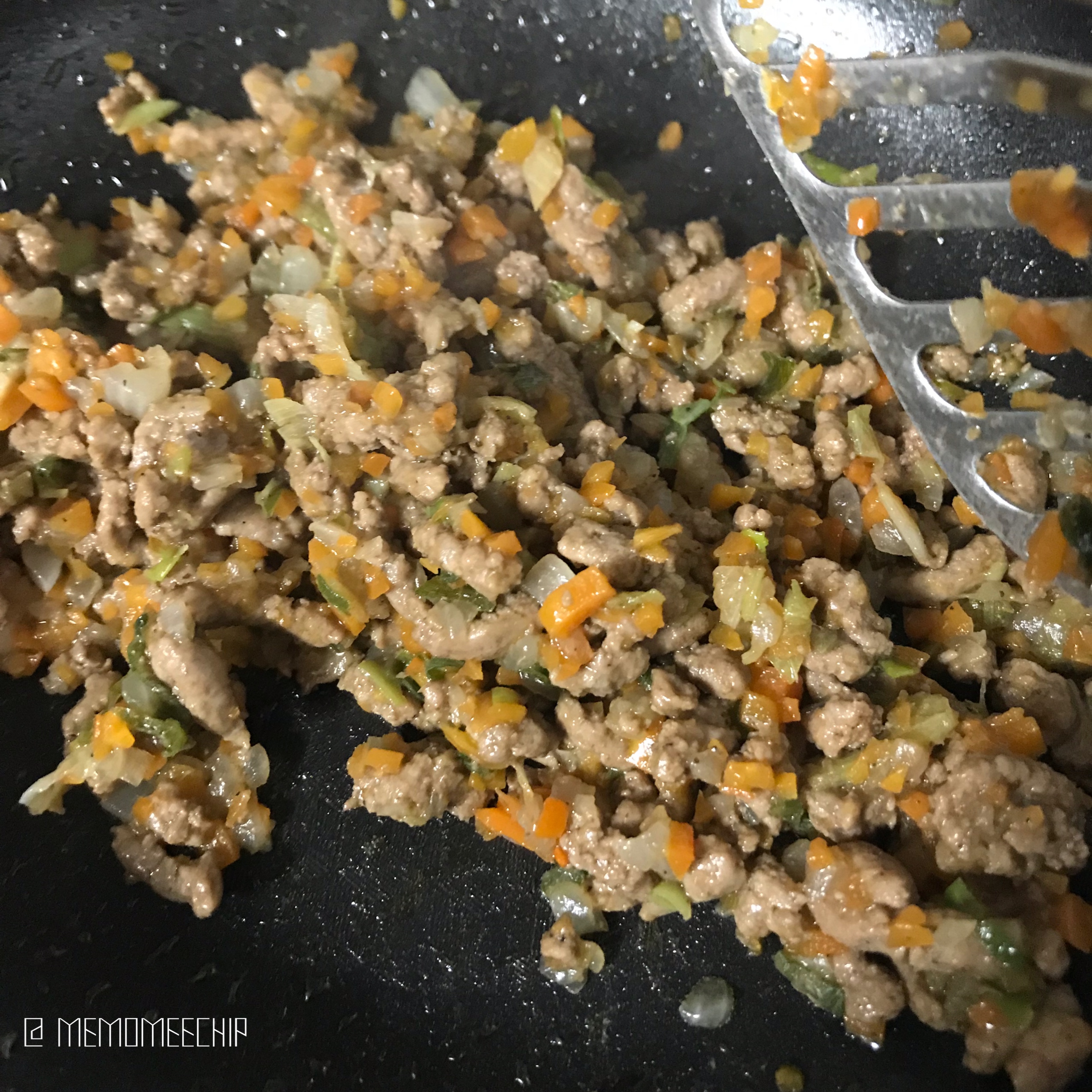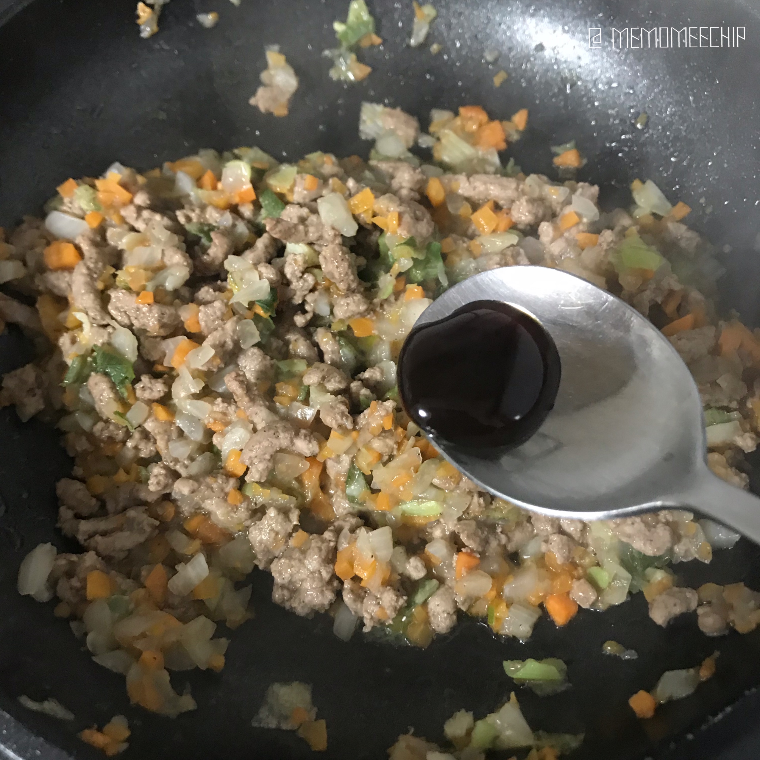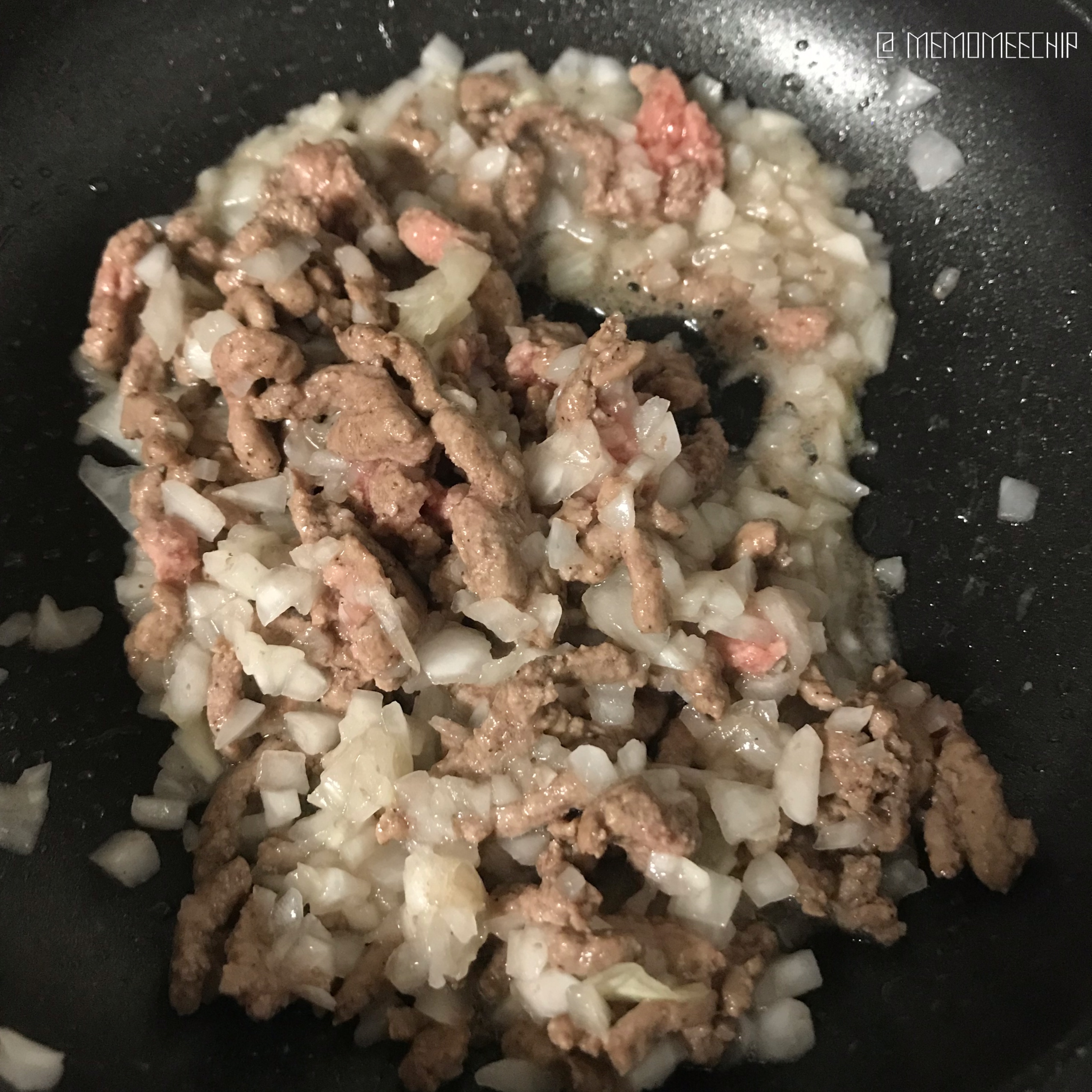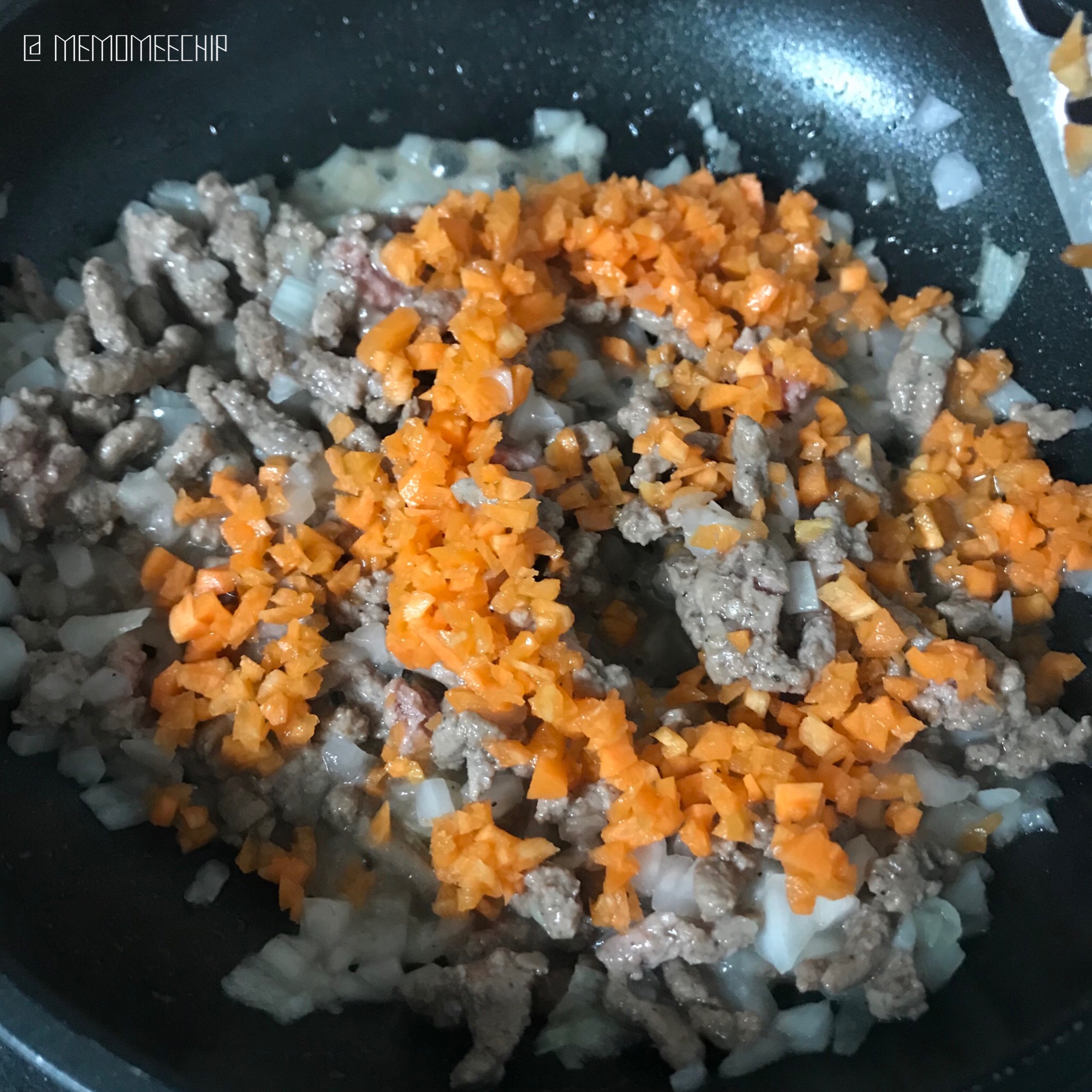 소고기가 익어갈 때 즈음, 다진 양파를 넣어 볶아줍니다.