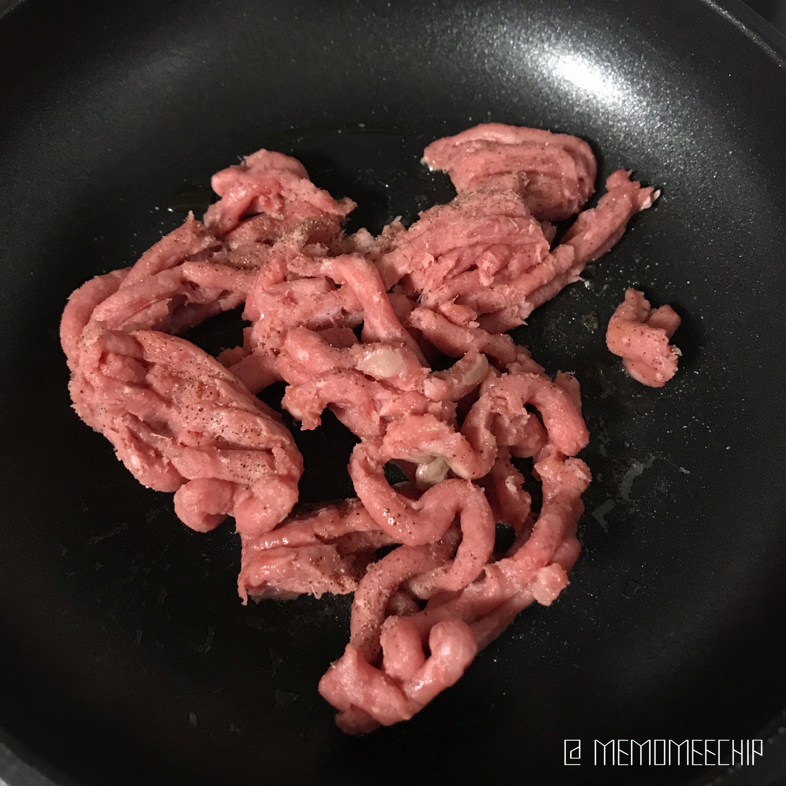 1. 달군 팬에 참기름을 살짝 두르고 소고기를 넣어, 소금과 후추를 약간 넣습니다.