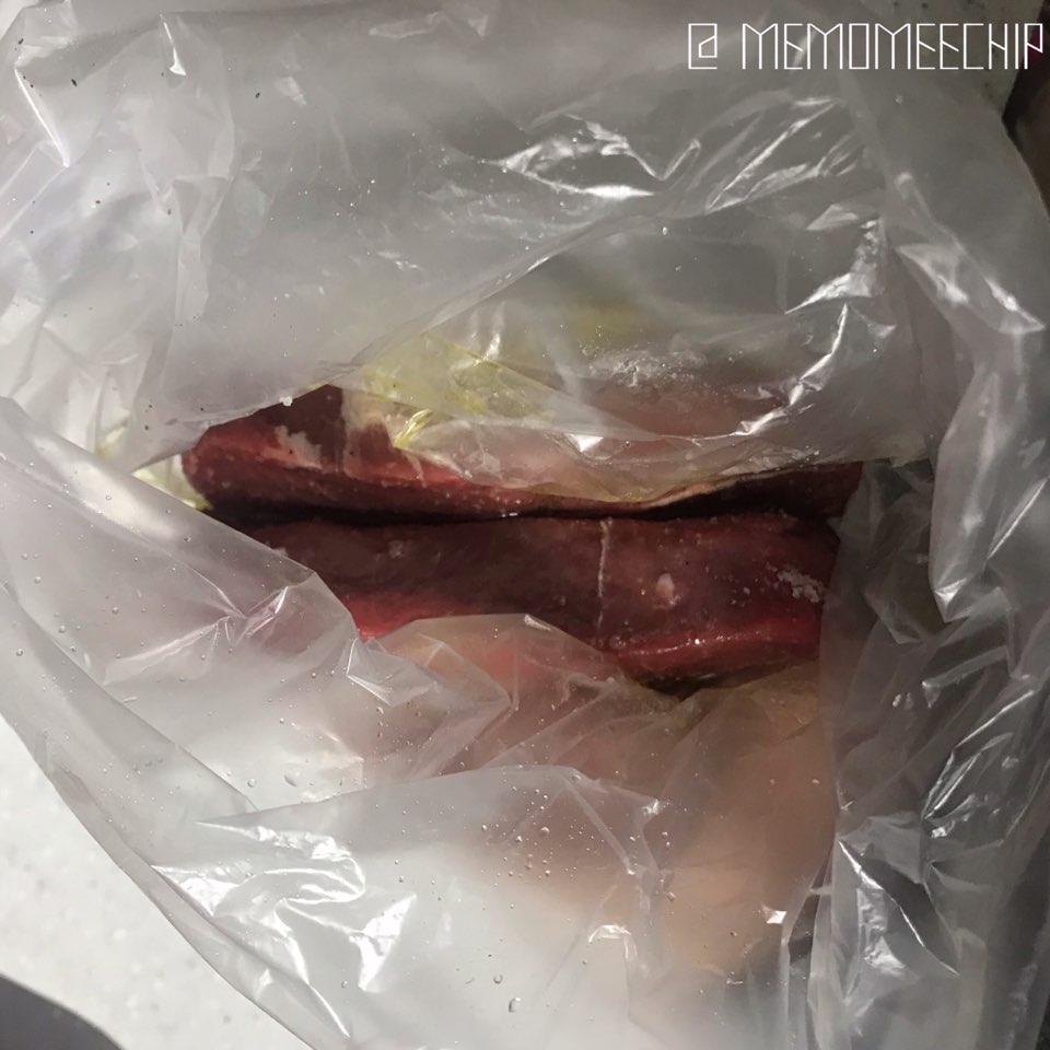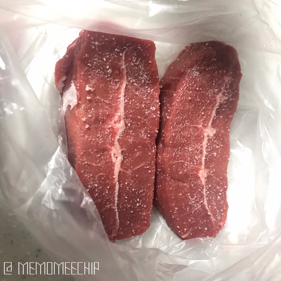 1. 비닐봉지에 소고기를 담아, 소금을 넉넉히 뿌려주세요.