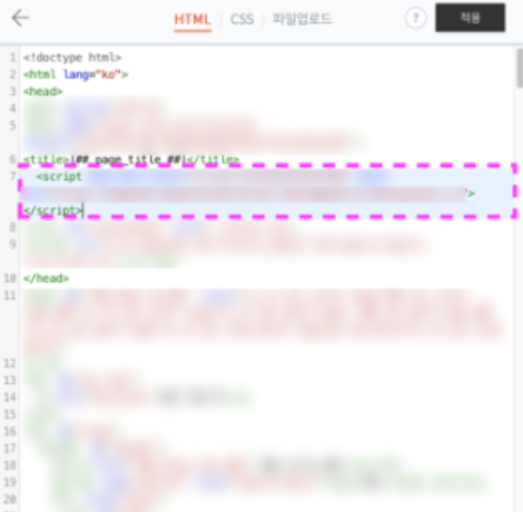<head> 바로 밑에 복사한 코드를 붙여넣고 적용을 누릅니다.