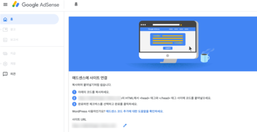 애드센스 사이트에서 홈을 눌러 본인 티스토리 블로그 사이트를 연결시키면