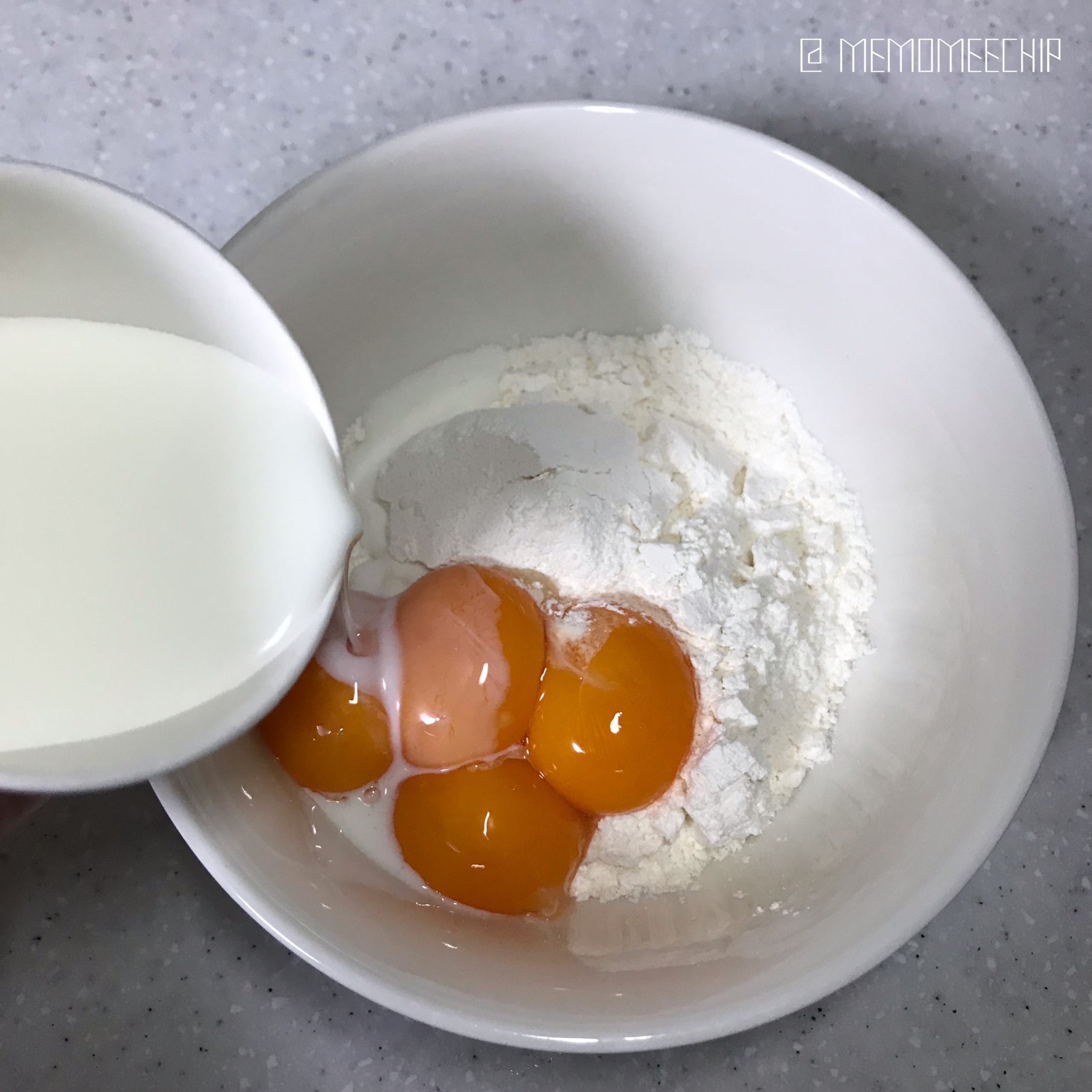 2. 핫케이크 가루 한컵 + 계란 노른자 + 우유 반 컵을 섞어줍니다.